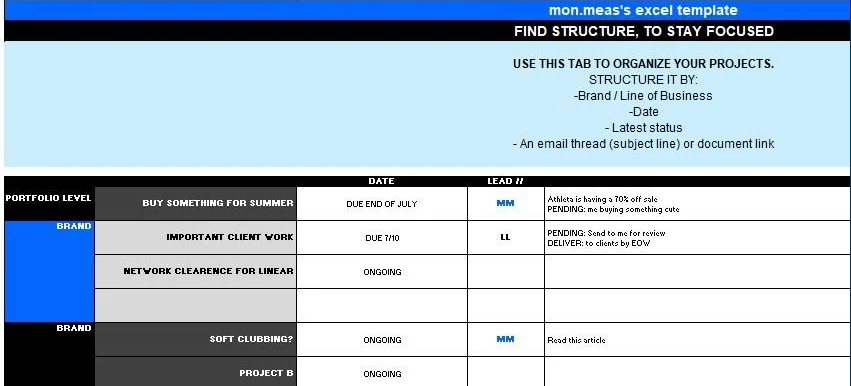 MY HISTORY WITH ITIn media, I’ve always managed multiple lines of businesses and teamsI created this Excel out of a need; looking for a better to-do list for me to update on a continuous basis. I like it because I can add 'Filters' and filter out to specific people, projects, clients...making it easy to access during meetings & projects